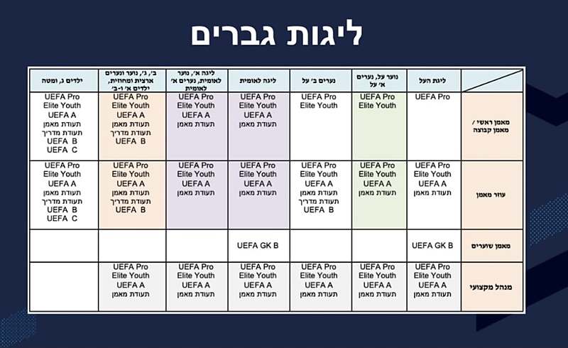 צחי נהרדע מאיגוד המאמנים פירסם היום את דרישות הסף של כלל הצוות המקצועי – מאמן ראשי, עוזר מאמן, מאמן שוערים ומנהלים מקצועיים, על פי חלוקה לליגות ושנתונים.