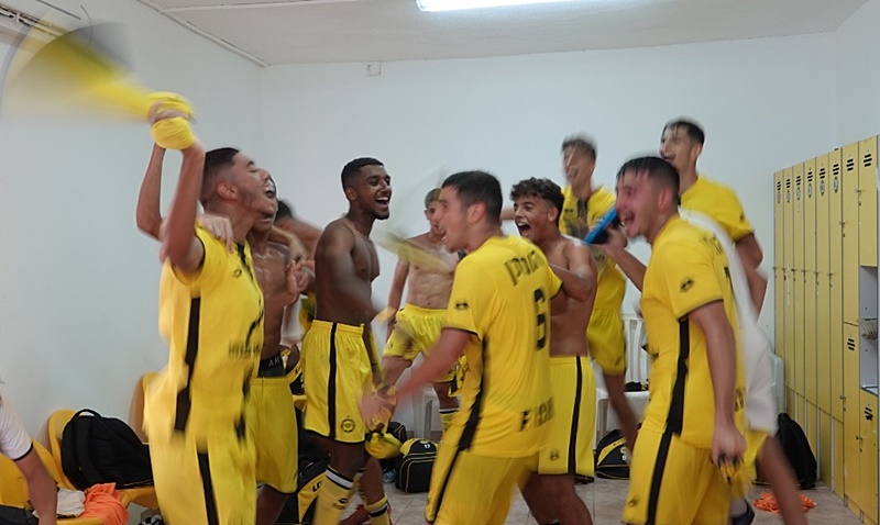 שחקני נערים א' של מכבי נתניה חוגגים את הניצחון בדרבי (שי לבוביץ)