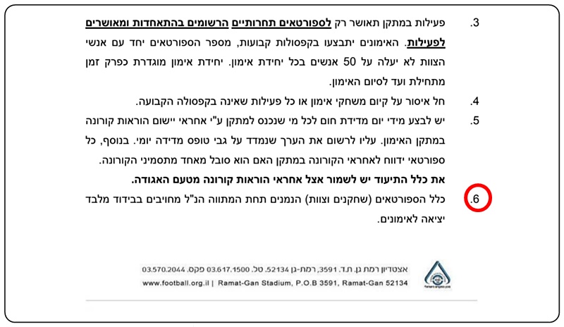 על פי המתווה וההבהרות שיצאו היום, פניות רבות הופנו למערכת אתר ג'וניורליג בדבר יישום ההנחיות. כפי שמופיע בסעיף 6 במכתב שהוציאה היום ההתאחדות לכדורגל, נקבע כי כלל הספורטאים (שחקנים וצוות) הנמנים תחת המתווה, מחויבים בבידוד מלבד יציאה לאימונים.
