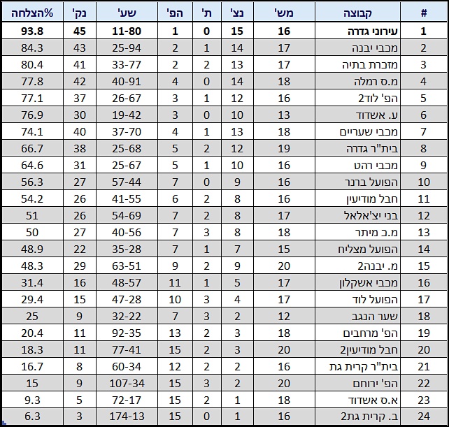 | 16 | 01/04/2024 | הפועל ברנר-מכבי שעריים | 6-1 |