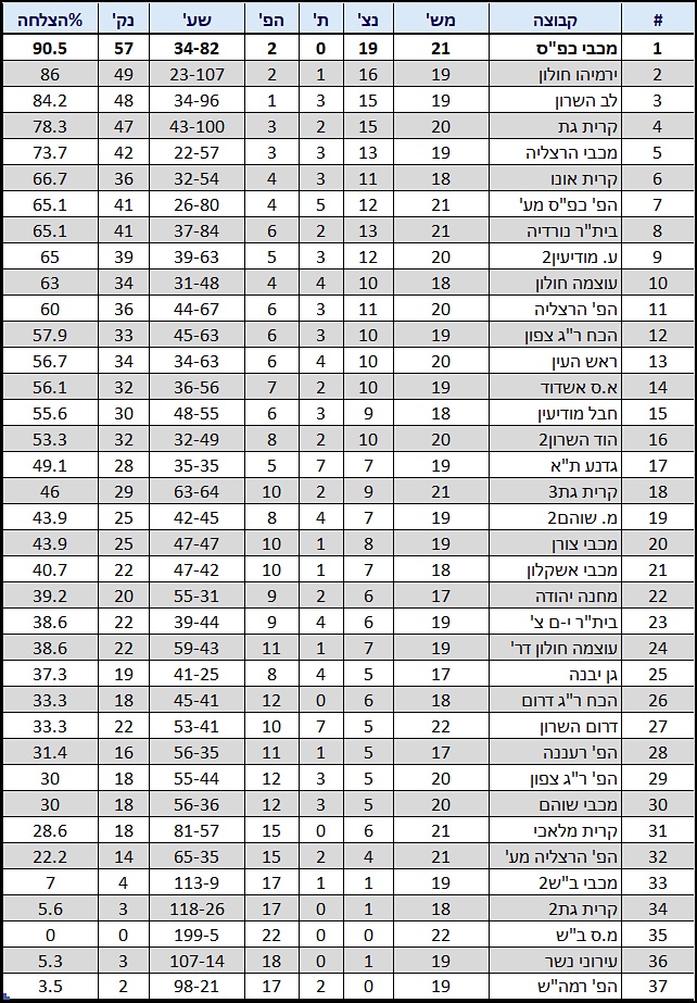 | 22 | 21/5/24 | הפ' ר"ג צפון-הפ' הרצליה מע' | 1-3 |
