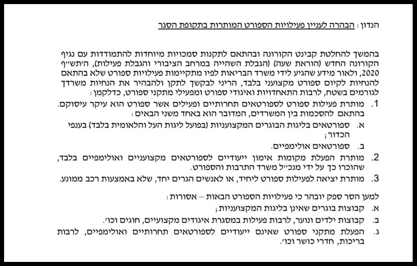 לאחר כל הרחש והבחש סביב חזרת הפעילות של מחלקות הנוער במהלך תקופת הסגר, משרד הבריאות הוציא הבהרה הנחייה למשרד התרבות והספורט על הפסקת הפעילות.