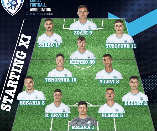 מאמן הנבחרת, גדי ברומר, ביצע שלושה שינויים מההרכב שפתח במשחק הניצחון על לוקסמבורג: אופק מליקה; גיא דזנט, שביט אלגבי (קפטן), רועי לוי, פארס אגבריה, ירין לוי, ניב יהושוע, יובל קרצו, יהלי שאבו, כארם זועבי ויאן יוסופוב.