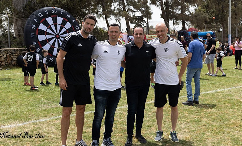 משמאל: עידן גולדבאום הבעלים, שלומי חבושה מאמן ילדים ב' האלופה, צחי נהרדע, מנשה חיים מאמן טרום א' (נתנאל בר אילן)