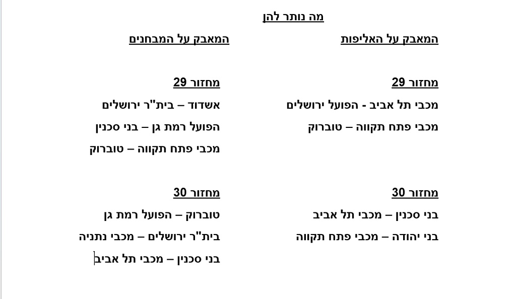 בשבוע הבא מחזור לסיום תארח מכבי תל אביב את הפועל ירושלים. בית"ר ירושלים צנחה למקום האחרון כאשר גם רמת גן וגם טוברוק האחרונה חלפו על פנייה בשבוע הבא תצא בית"ר למשחק חוץ מול אשדוד המידרדרת.