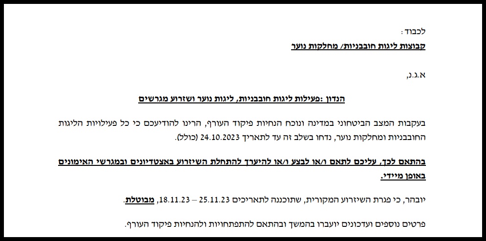 לאחר שבשבת הודיעה ההתאחדות לכדורגל כי מחזור סוף השבוע הקרוב בוטל לאור המצב הביטחוני, היום (שלישי) ההתאחדות הודיעה כי בעקבות ביטול המשחקים ולאור הביטולים העתידיים הצפויים – פגרת שזרוע החורף שתוכננה למחצית השנייה של חודש נובמבר מבוטלת, כמו כן הפעילות במחלקות הנוער מבוטלות עד ה 24/10.